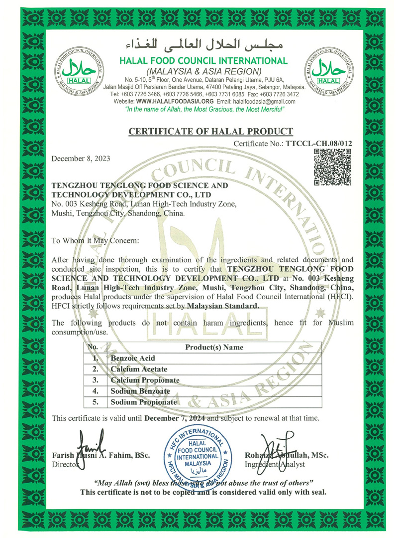 公司專業生產苯甲酸,苯甲酸鈉,丙酸鈣,丙酸鈉和醋酸鈣等系列產品